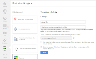 Langkah terakhir silahakan masuk ke Google + anda pilih menu Lainnya > Laman/situs, kemudian pilih buat laman/situs>Lainnya. masukan nama laman situs anda misal About Me, kemudian pada kolom URL isi dengan alamat url About Me yang sudah dibuat tadi.
